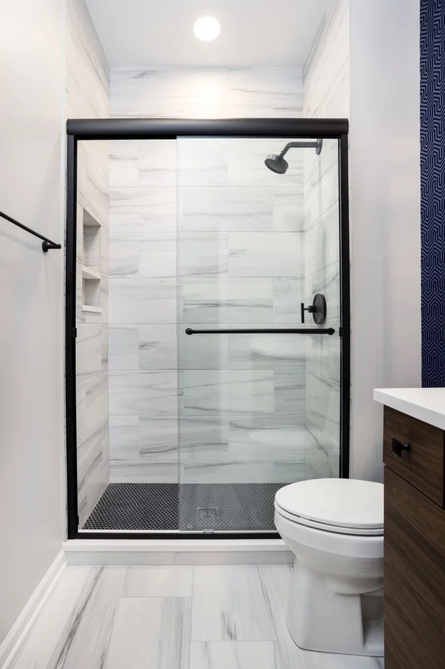 The shower area was completely rebuilt and upgraded with large-format marble-look porcelain tiles installed on the walls. A frameless glass enclosure with a black metal profile was added, along with a modern shower system and a built-in wall niche for storage.