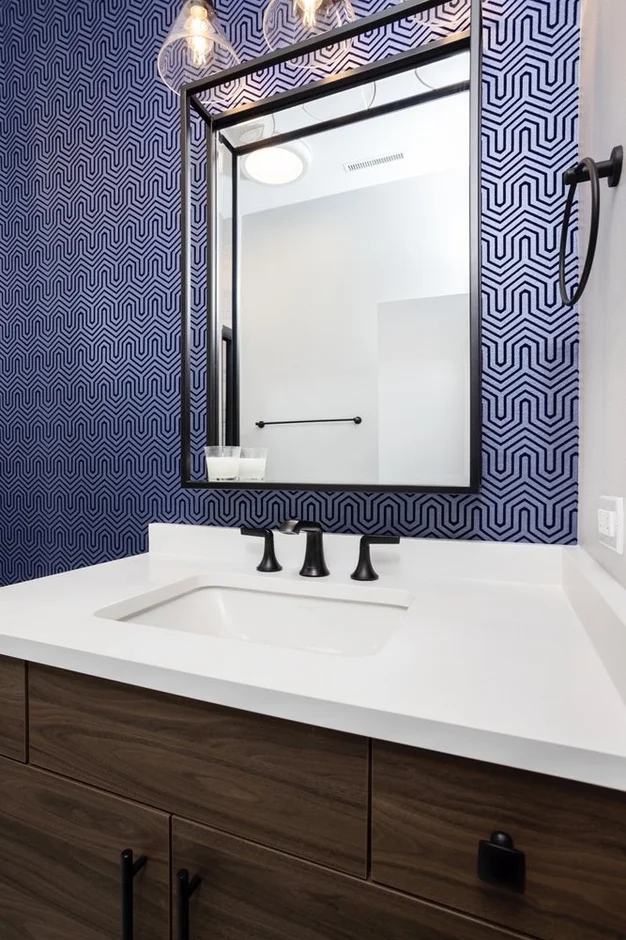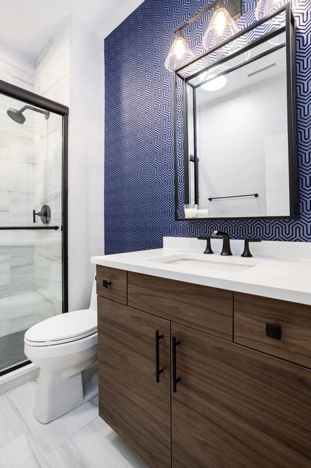 The vanity wall was finished with decorative geometric wallpaper in deep blue tones, adding character and a strong visual accent to the space. Remaining wall surfaces were repaired and finished for a clean, polished look.