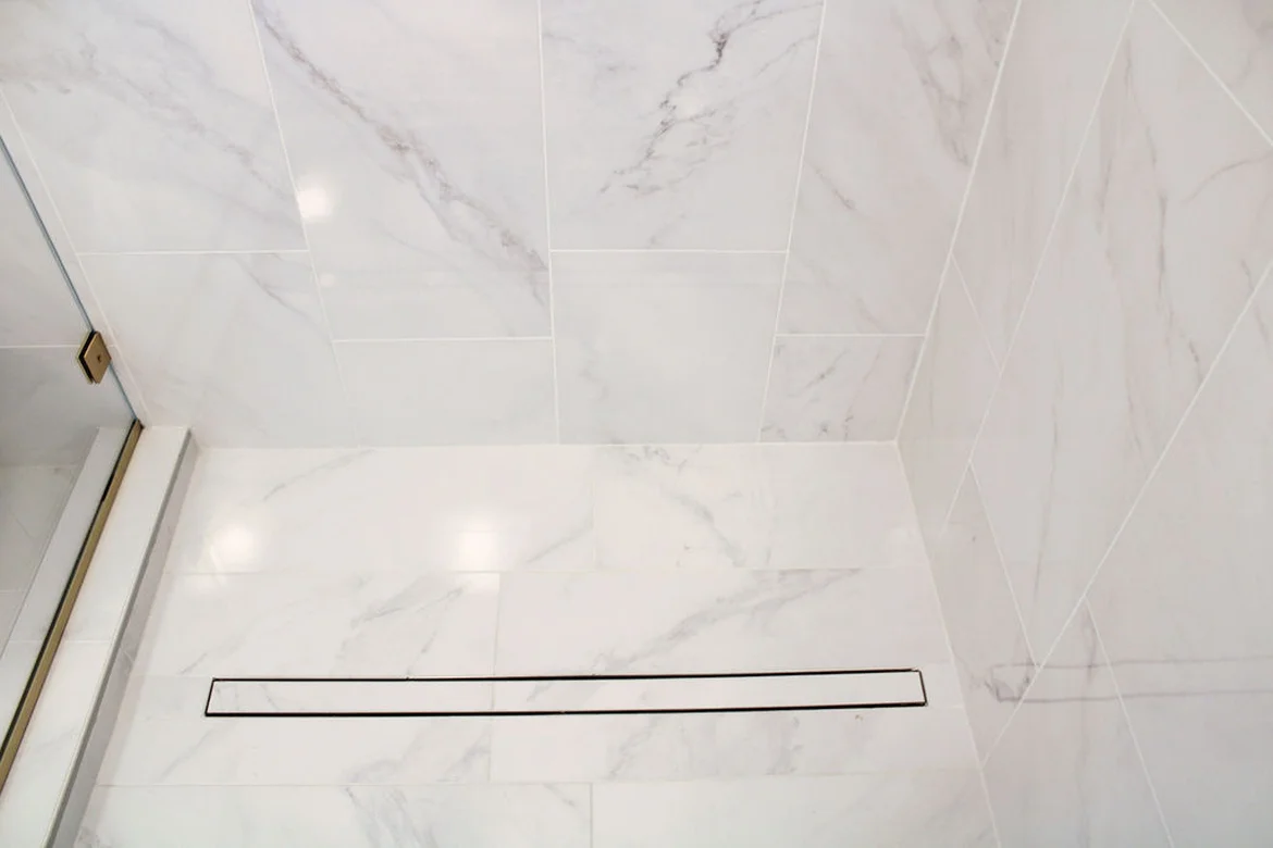 A raised shower platform was constructed to properly manage water flow and support the walk-in shower design. A linear drain was installed with precise floor slope, and all shower surfaces were fully waterproofed to ensure long-term protection in wet areas.