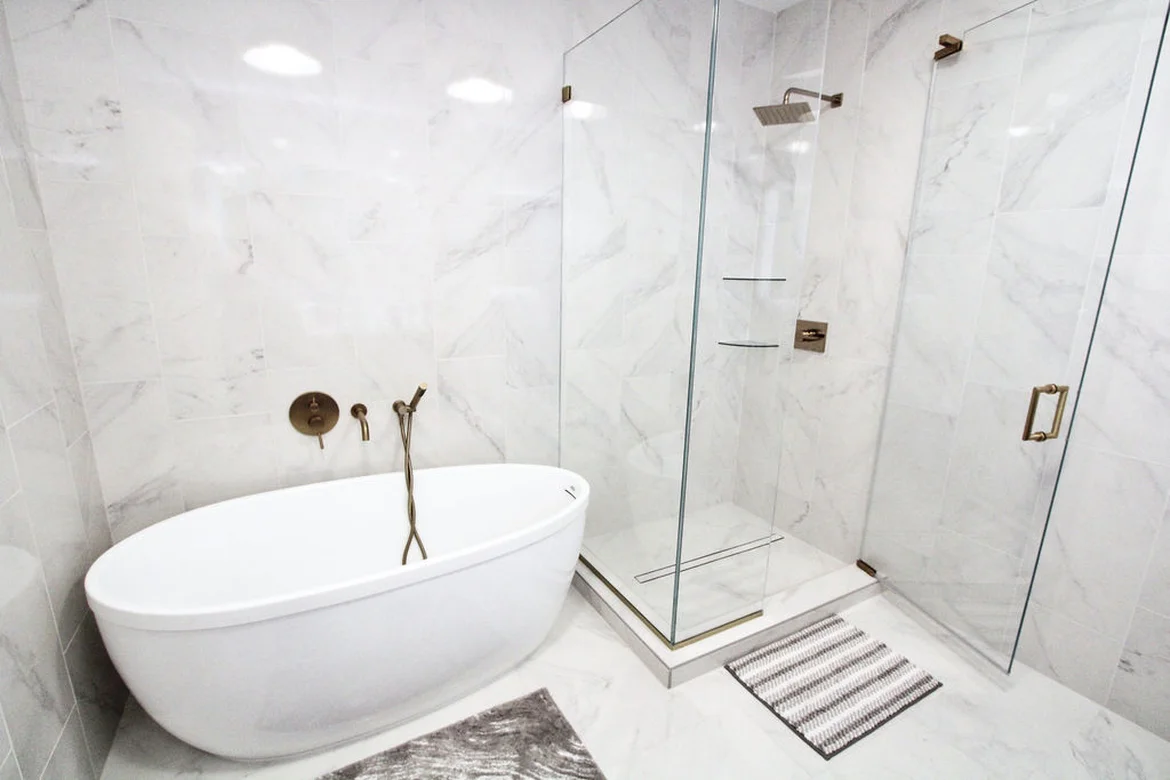 Final details included the installation of frameless glass shower panels, modern plumbing fixtures, and bathroom accessories, completing a cohesive and polished renovation.