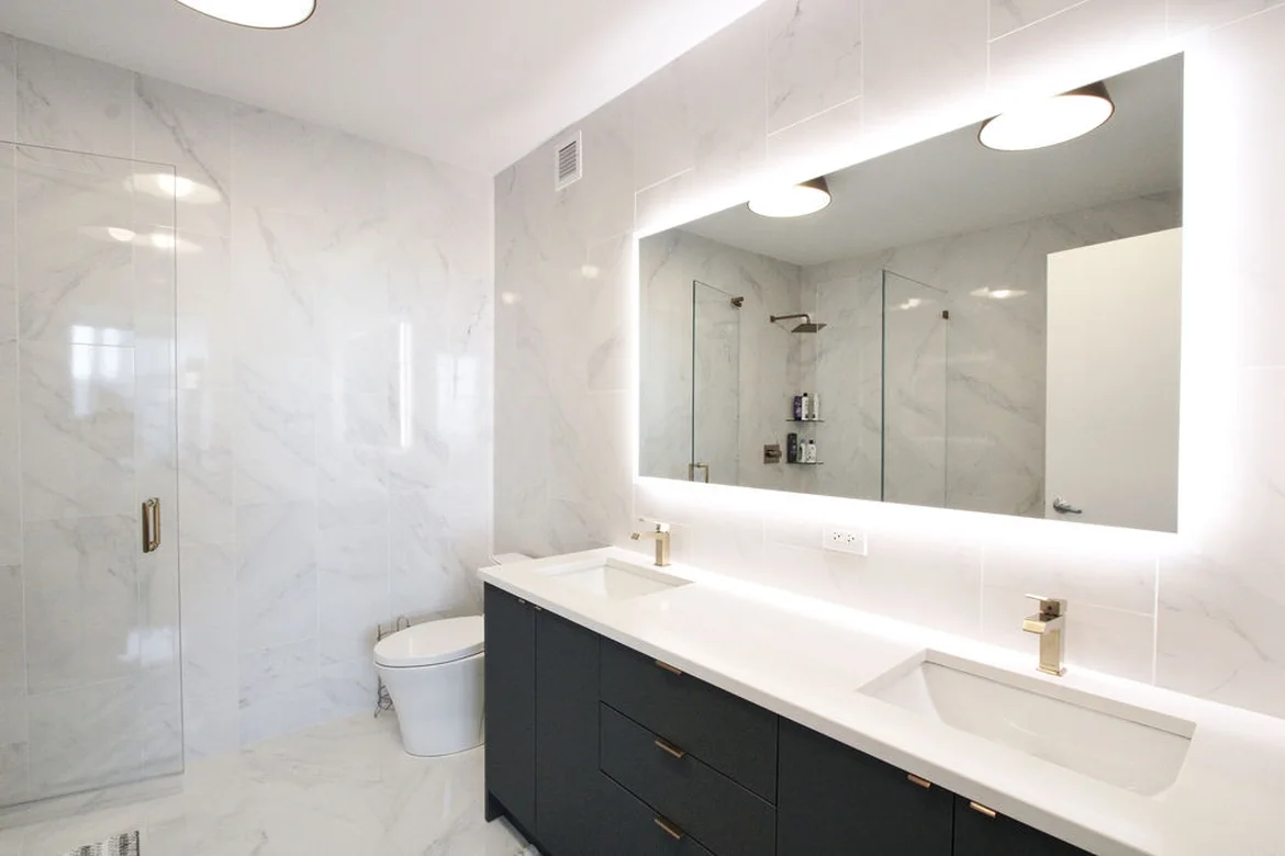 A custom double-sink vanity with modern cabinetry was installed to provide ample storage and everyday functionality. The vanity is topped with a sleek, solid-surface countertop and integrated sinks for a clean, contemporary finish.