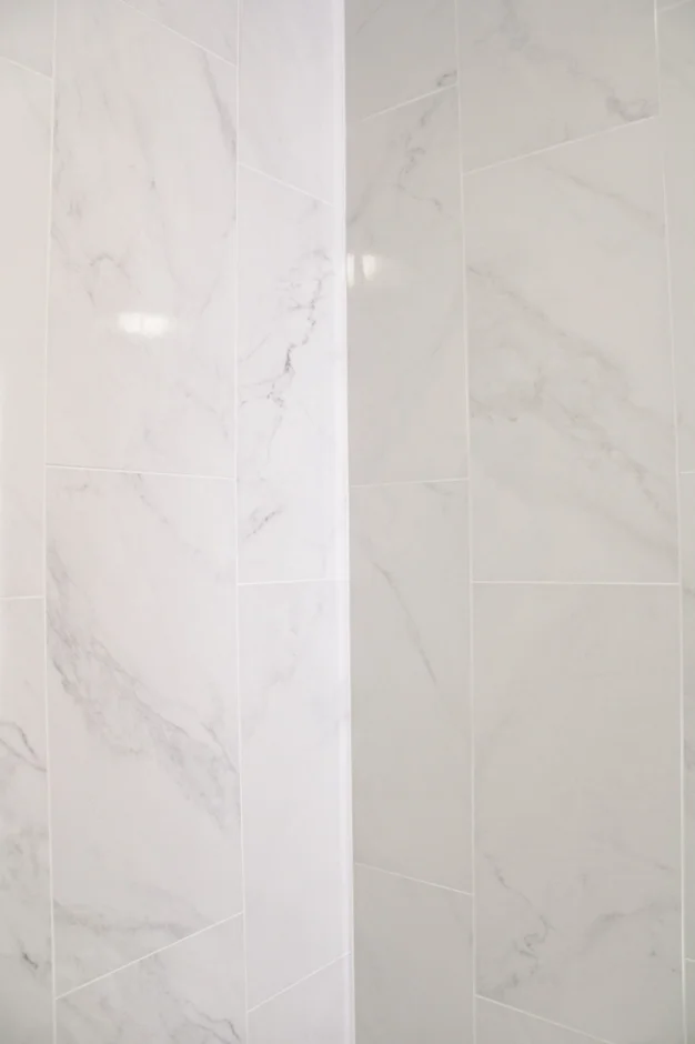 Large-format, marble-look porcelain tile was installed throughout the bathroom on both floors and walls. This durable, water-resistant material enhances the visual continuity of the space and elevates the overall design.