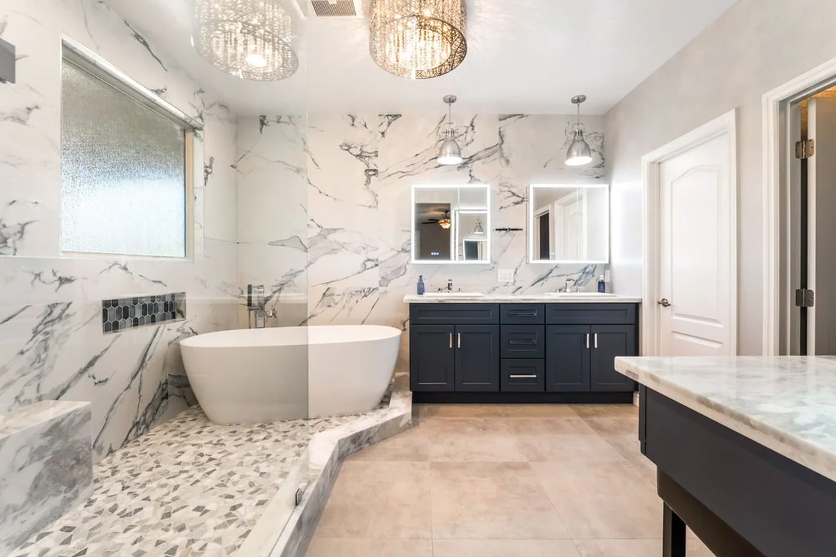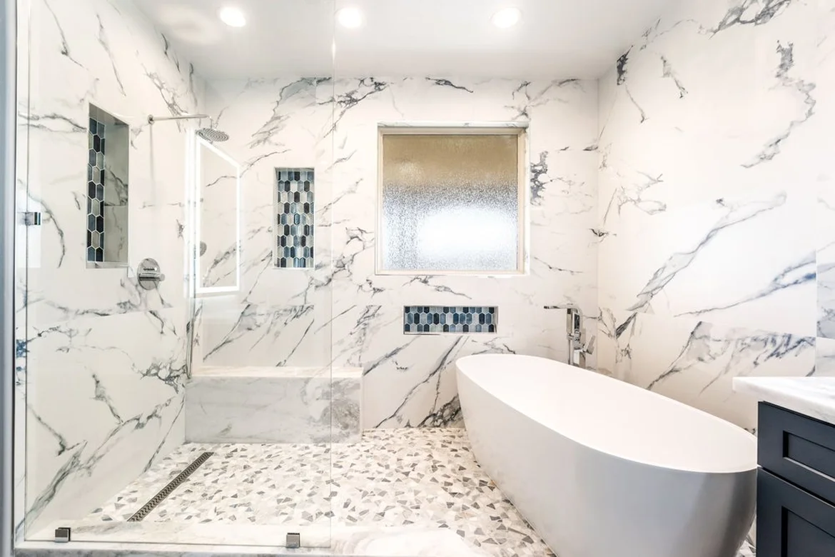 Bathroom walls were upgraded with marble-look tile finishes, adding visual depth and a high-end aesthetic. The new wall surfaces create a cohesive, polished appearance while improving durability in wet areas.