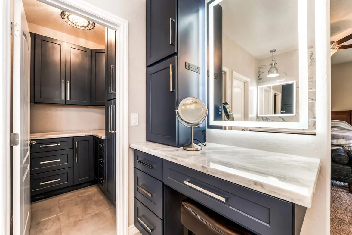 A marble-veined stone countertop was installed, paired with integrated sinks for a clean and streamlined look. The new surface offers easy maintenance while enhancing the overall elegance of the vanity area.