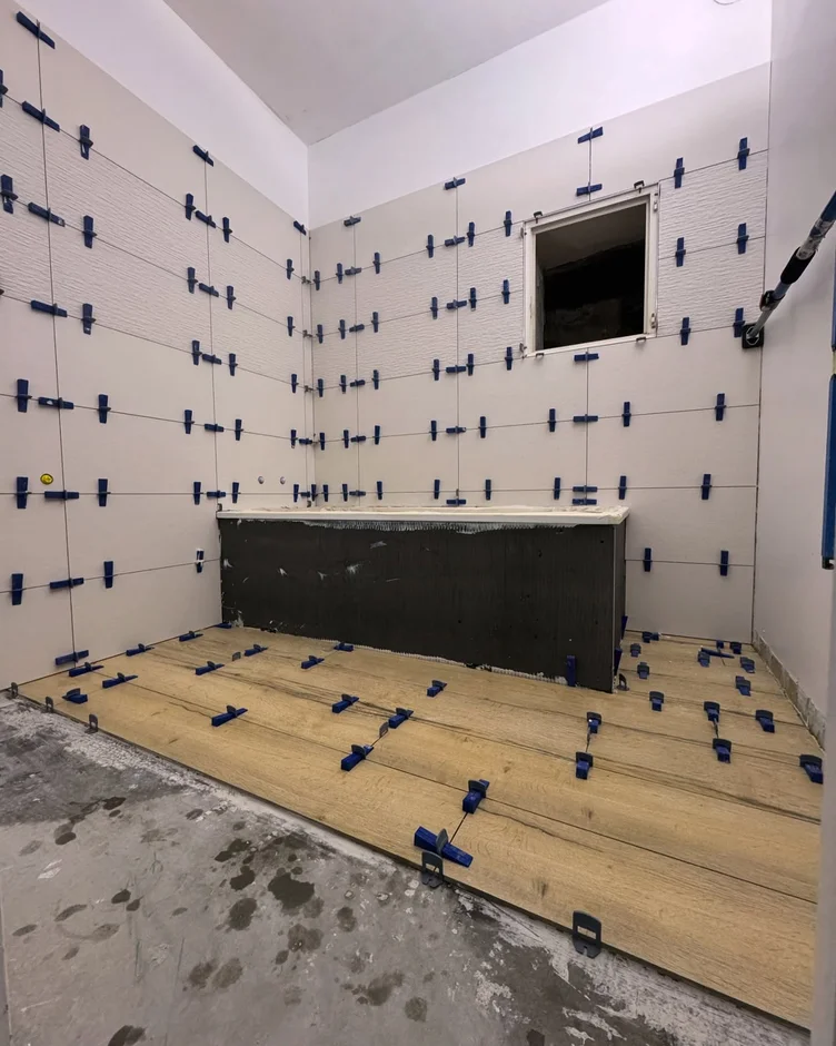Installed large-format beige tiles across the wet zone to create a uniform, bright, and visually expanded space. The subtle texture on the accent strip adds depth without overwhelming the room. -