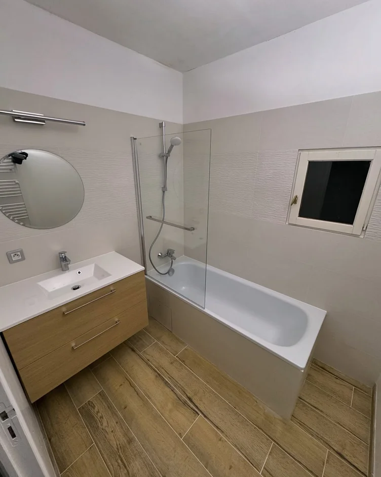 This renovation updates a compact bathroom with a clean, calm and modern aesthetic, balancing warm wood textures with soft beige tiles. The result is a bright and functional space with improved ergonomics and a more contemporary material palette.