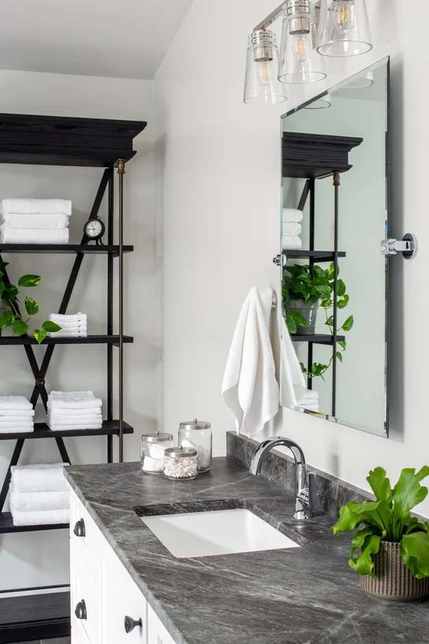 The outdated vanity was removed and replaced with custom white cabinetry featuring shaker-style doors. A durable stone countertop was installed along with two undermount sinks. A freestanding shelving unit was also added to provide accessible storage and complement the updated layout.