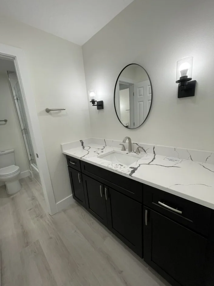 A new double-sink vanity with dark shaker-style cabinets was installed, paired with a marble-veined quartz countertop. The updated hardware and soft-close drawers contribute to both elegance and everyday convenience.