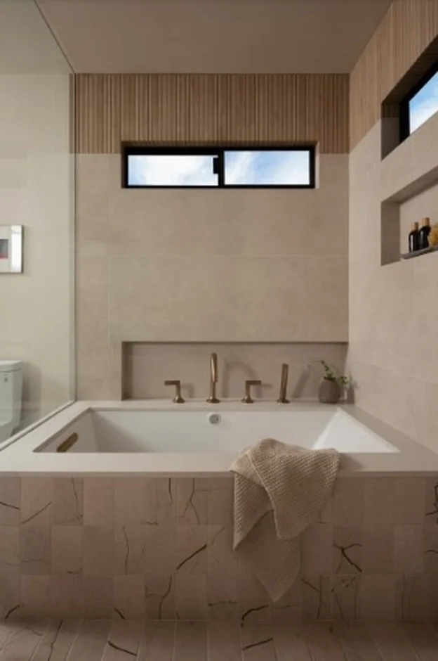The design emphasizes clean lines, layered textures, and subtle luxury — vertical wood slat accents add warmth and visual interest, while large-format porcelain tiles provide a calm, understated backdrop. Strategic niches, natural light from clerestory windows, and carefully selected fixtures elevate functionality without sacrificing elegance.