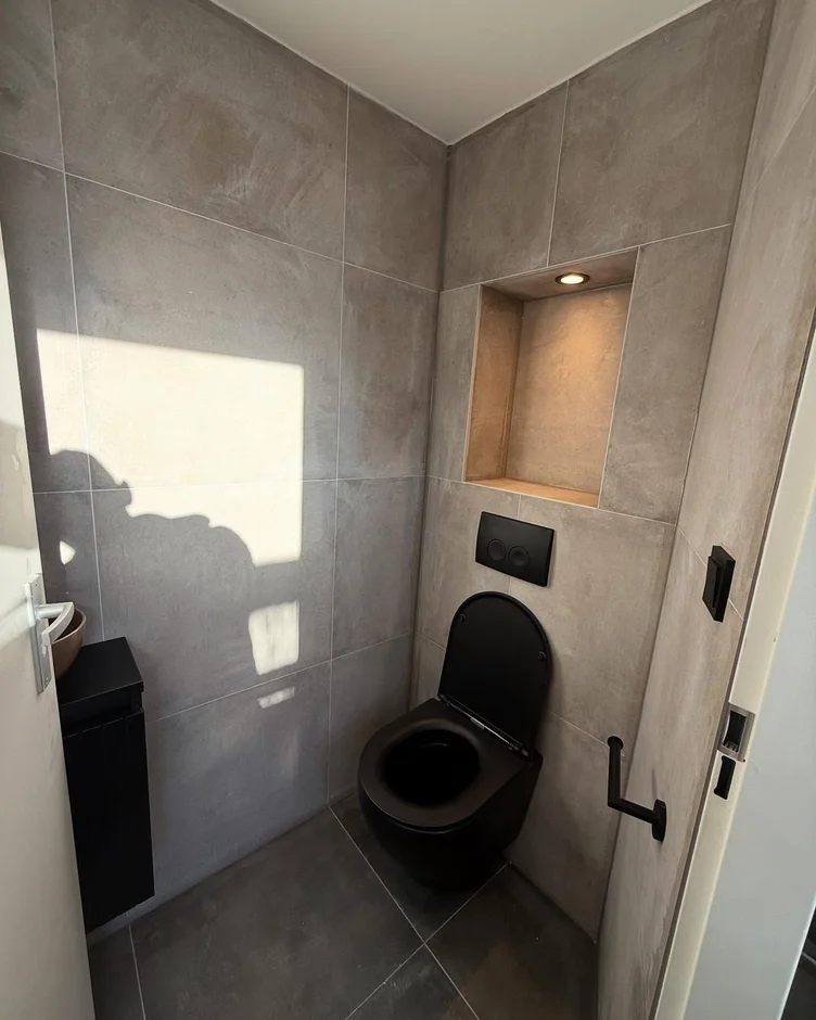 Installed a wall-mounted black toilet with a concealed cistern and flush plate for a clean, minimalist look and easier floor maintenance. -