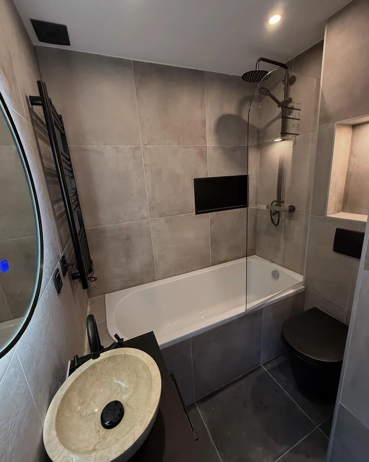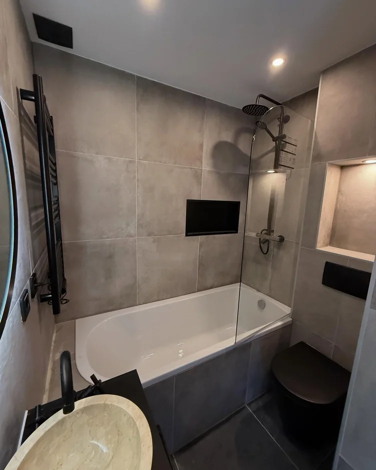 Fitted a matte black shower system including a rain shower head and hand shower, adding a strong modern contrast against the neutral wall finishes. -