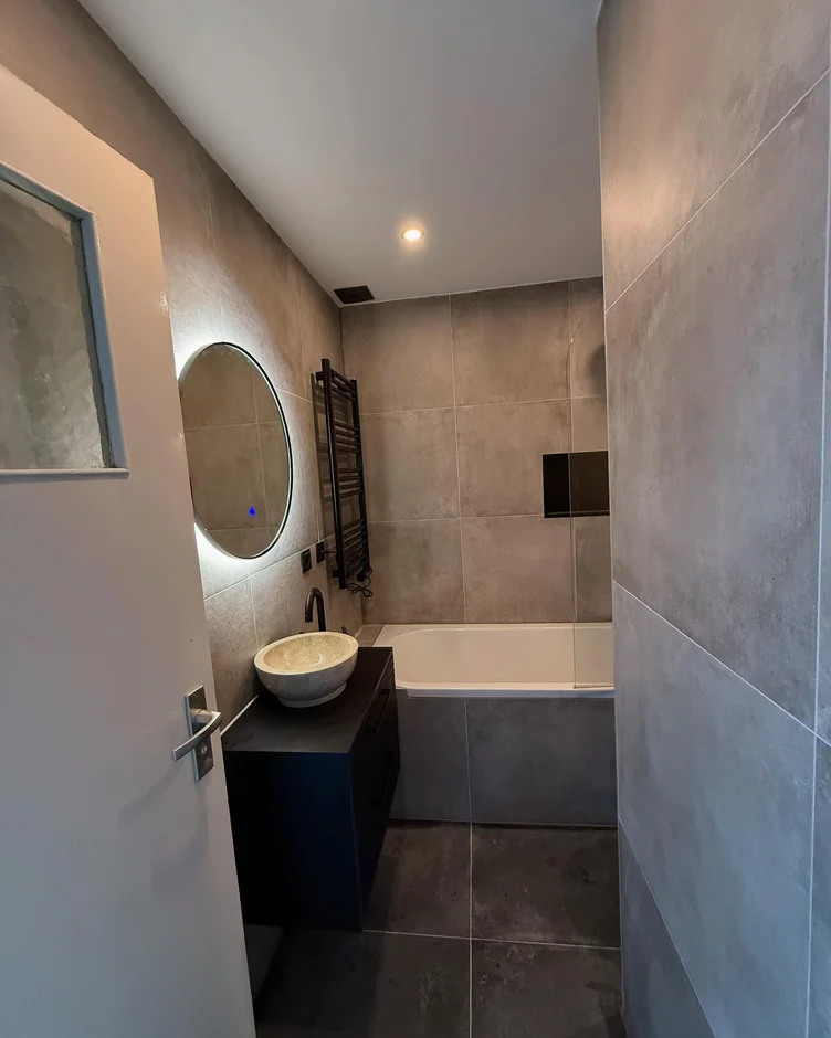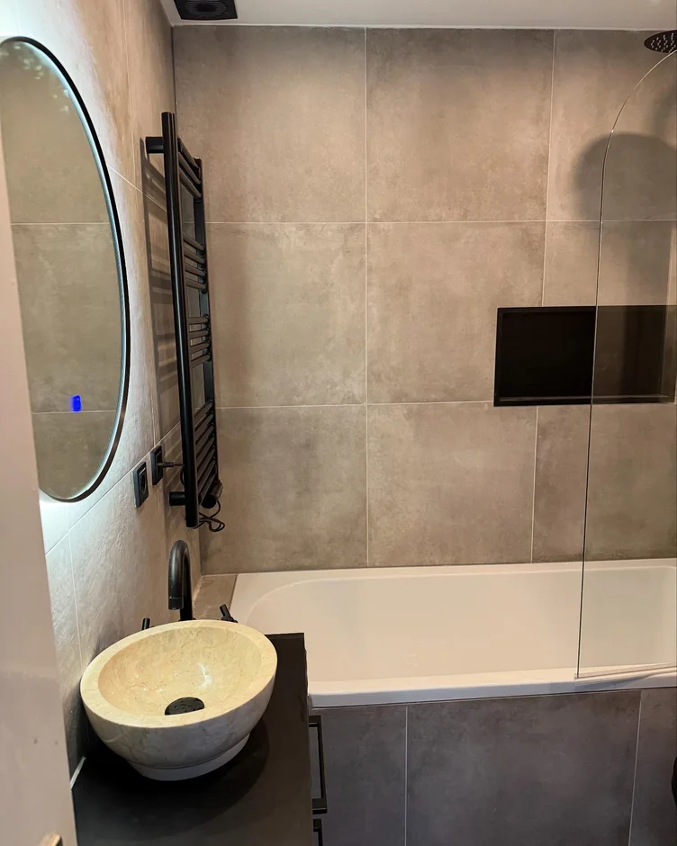 Finished floors and walls with large-format stone-look tiles, selected for durability, water resistance, and a contemporary aesthetic.