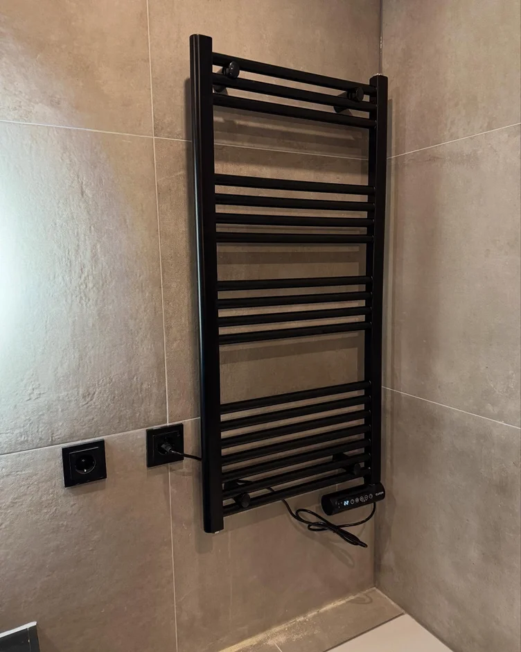 Installed a matte black heated towel rail to improve comfort while matching the overall fixture palette. -