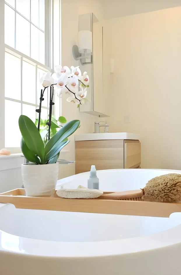 Wall Finish: Used a subtle, textured wall covering or paint in a light neutral shade (like a warm grey or taupe) to brighten the room while maintaining a calming palette.