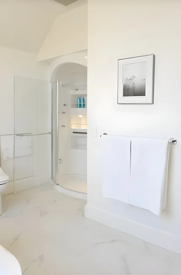 Shower Enclosure: Installed a frameless glass shower screen to visually open up the space, replacing any shower curtain or opaque enclosure for a cleaner look.