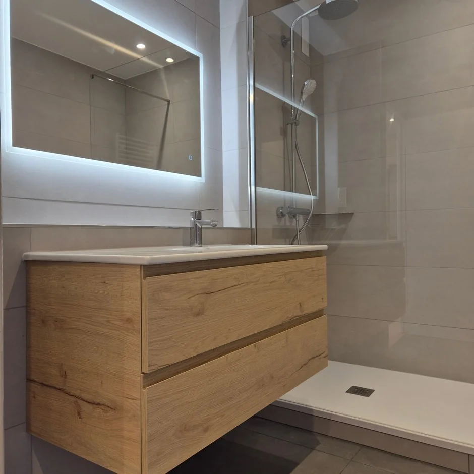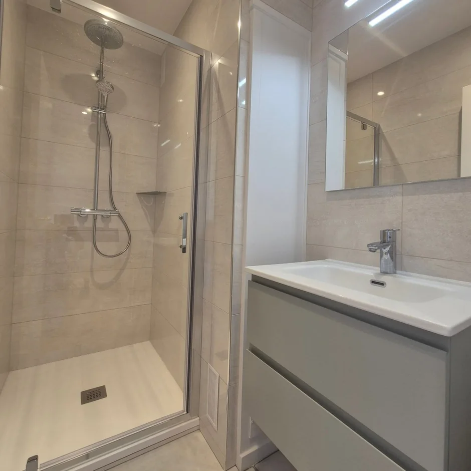 This renovation delivers a clean, contemporary bathroom defined by soft beige tones, minimalist fixtures, and a refined balance of natural and modern textures. The space feels bright, calm, and highly functional, with thoughtful detailing that enhances daily comfort.