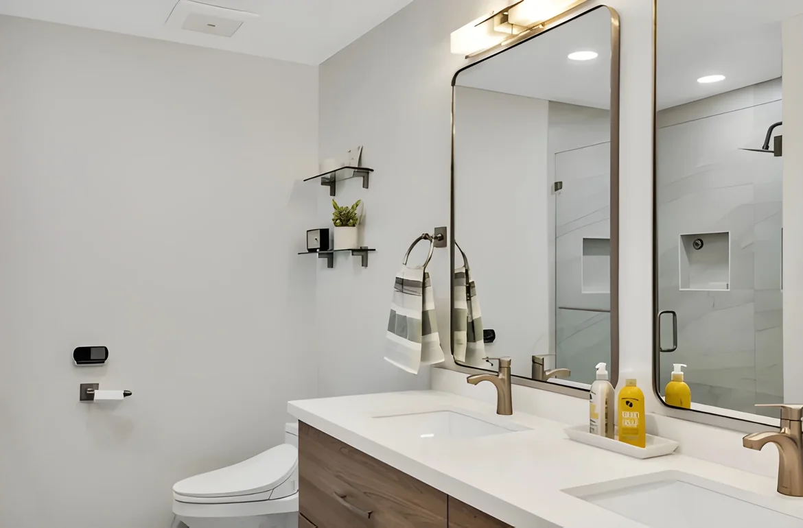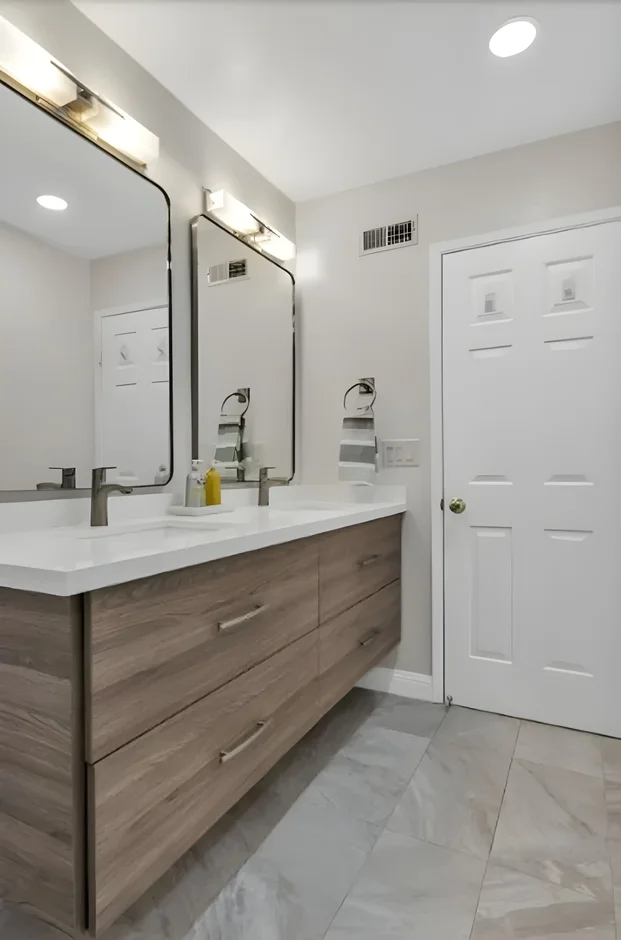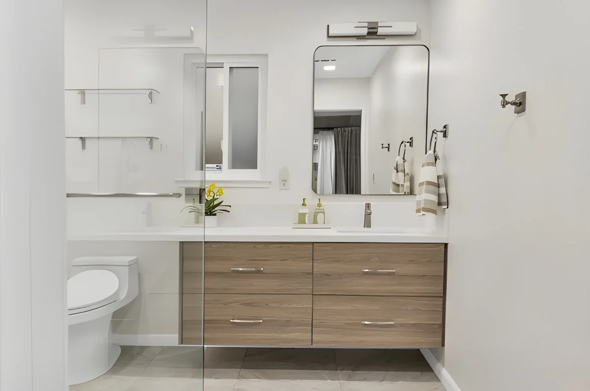 The renovated bathroom is now a serene, modern sanctuary with open flow, premium materials, and thoughtful accessibility features. The neutral tones, warm wood accents, and abundant light create a relaxing spa-like atmosphere while maximizing space and storage — delivering daily luxury and increased home value.
