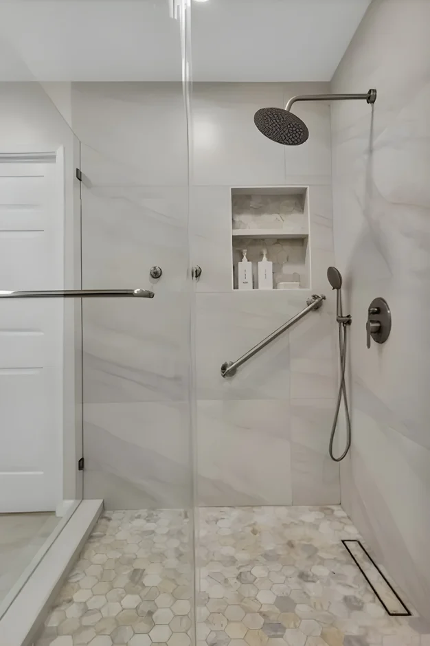 Removed the tub and installed a spacious curbless walk-in shower with frameless glass, rainfall and handheld showerheads, built-in niche, and grab bars for safety. -