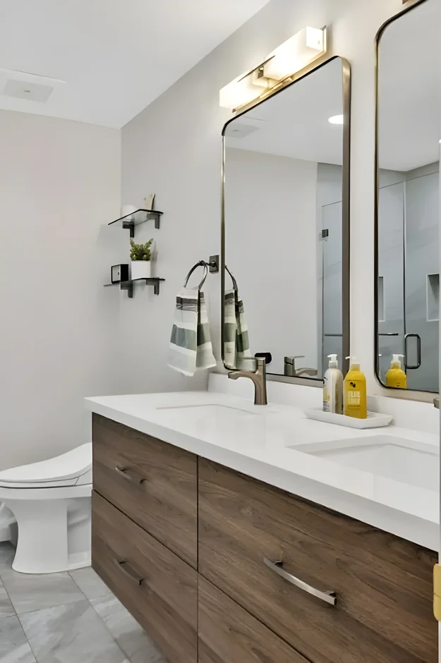 Added a floating double vanity in rich wood finish with quartz countertop, brushed gold faucets, and dual undermount sinks. -