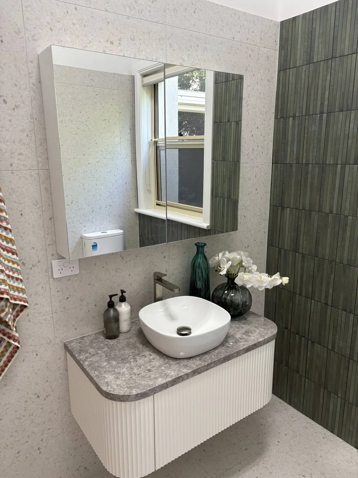 Installed terrazzo-look tiles and vertical textured green tiles to add depth, contrast and a calm modern character. -