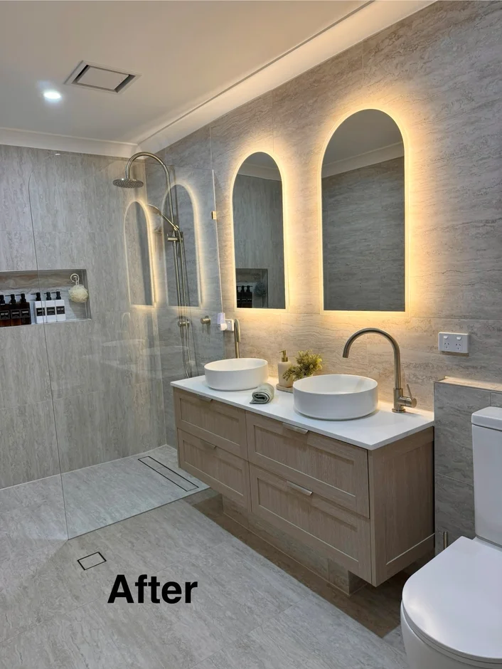This bathroom renovation delivers a fresh, modern aesthetic with soft stone textures, warm lighting, and clean architectural lines. The new design replaces the dated finishes with a bright, open, spa-like environment that feels both functional and luxurious.
