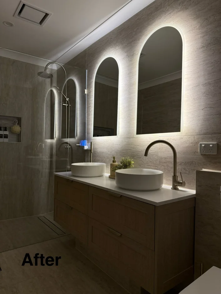 Installed two architectural arched mirrors with integrated LED backlighting to create soft ambient illumination and a refined focal point. -