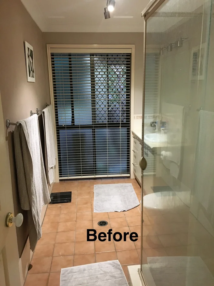 Replaced the old framed shower with a sleek walk-in design featuring large stone-look tiles, a linear drain, and elegant brushed fixtures for a minimalist, hotel-inspired feel. -