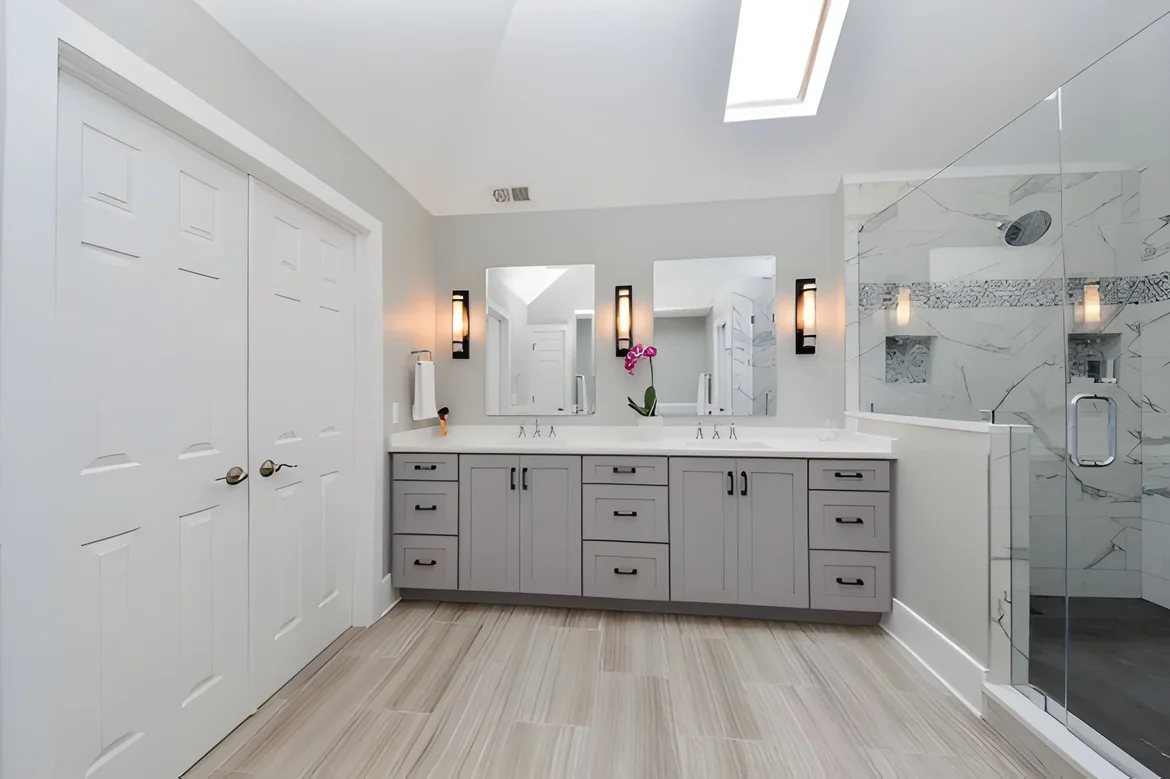 Installed a new custom-built double-sink vanity in a modern soft-gray finish.
