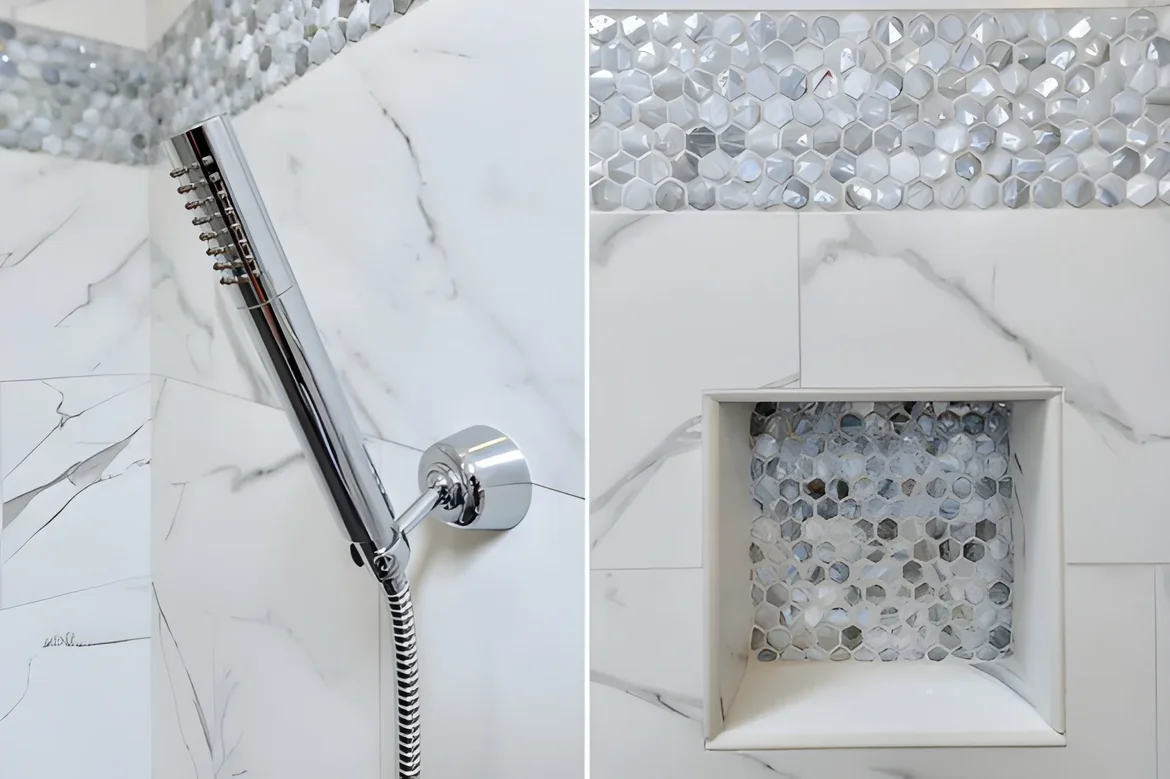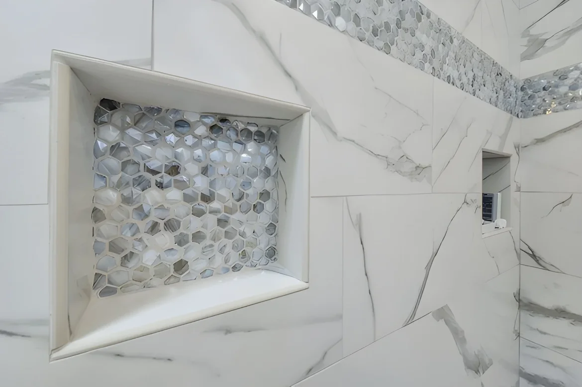 Added a decorative mosaic accent band and matching niche tile.