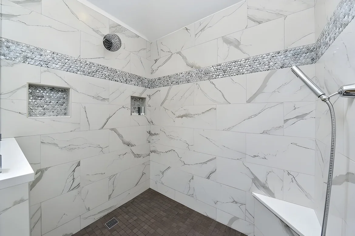 Built a barrier-free walk-in shower with large-format marble-look wall tiles.