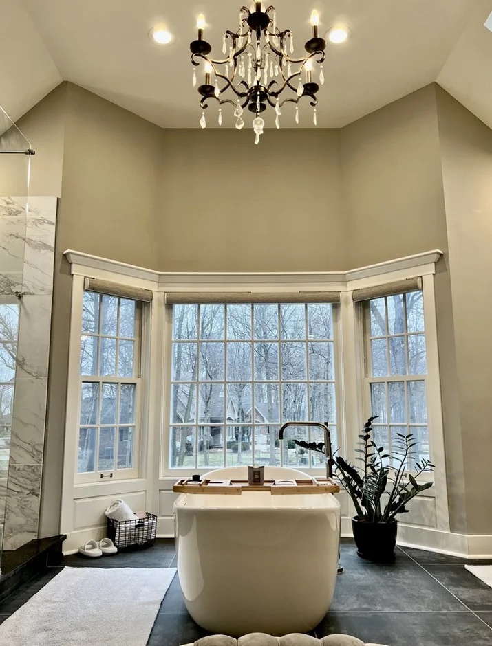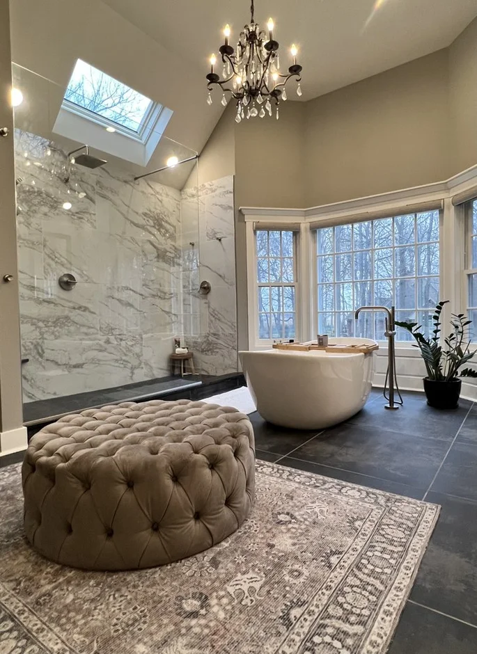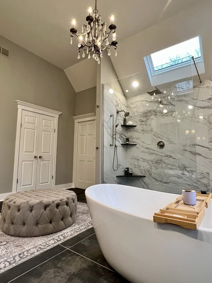 All lighting was upgraded, including recessed ceiling lights, elegant wall sconces, and a decorative chandelier that serves as a focal point above the freestanding tub. The improved lighting layout enhances both ambiance and everyday functionality.