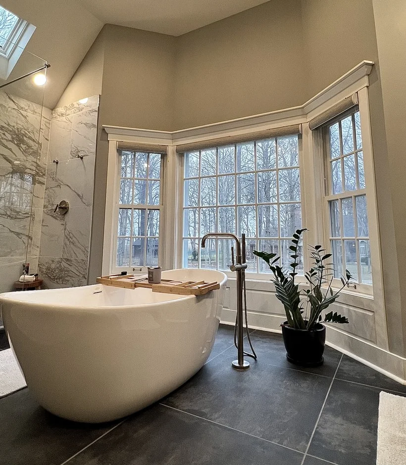 The previous built-in tub was removed and replaced with a sleek, freestanding soaking tub. A minimalist floor-mounted faucet and wooden bath caddy were added to create a relaxing, spa-inspired atmosphere.