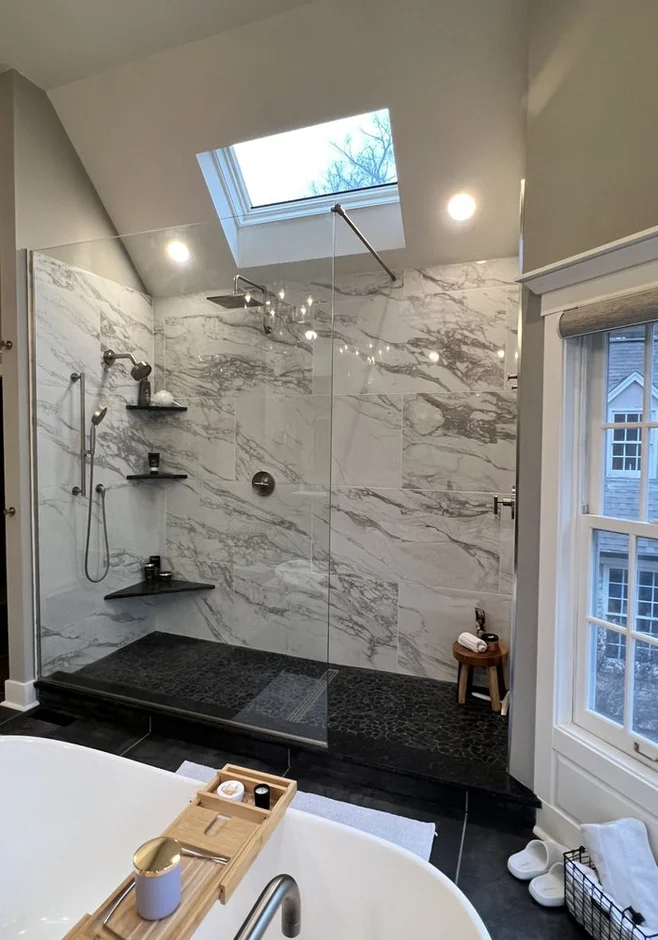 The old shower area was completely removed and replaced with a spacious glass-enclosed walk-in shower. Large marble-style porcelain tiles were installed on the walls, complemented by a dark stone-textured shower floor. A new rainfall showerhead, handheld sprayer, and modern fixtures enhance both comfort and performance. Built-in corner shelves provide elegant and practical storage.
