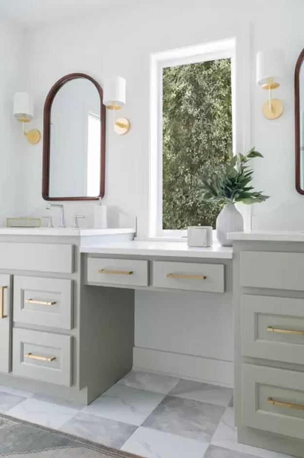 Added a full double-vanity setup with new quartz countertops, integrated sinks, and a lowered center makeup counter for functionality and comfort.