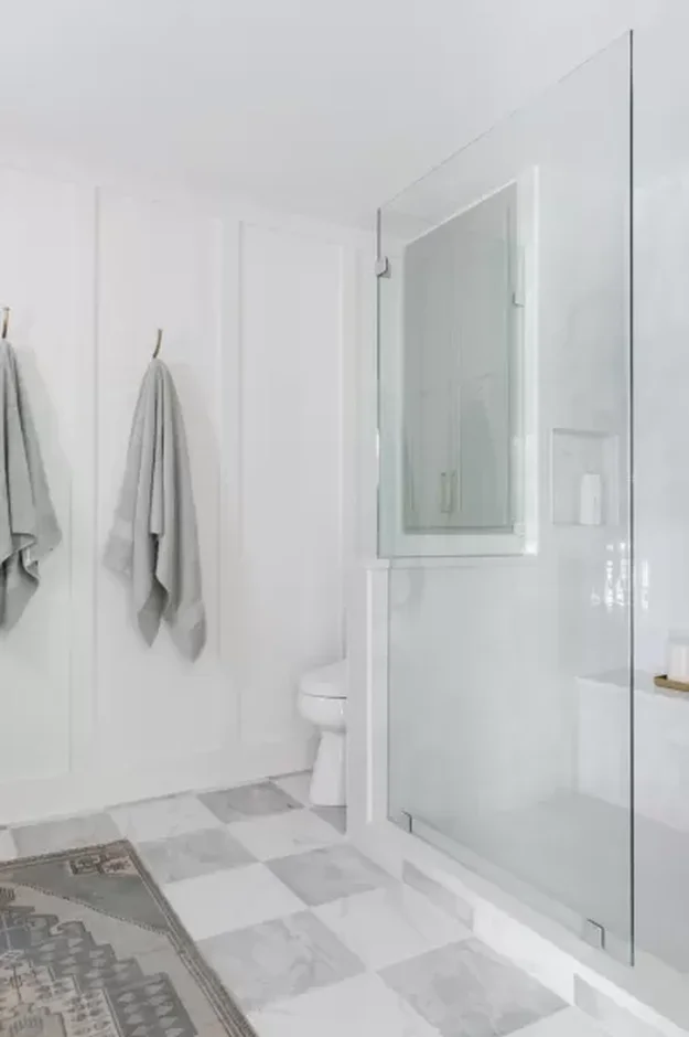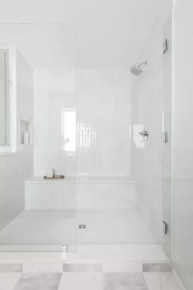 Updated all tile surfaces, installing bright white shower walls and a new patterned marble-style floor for added elegance and visual interest.
