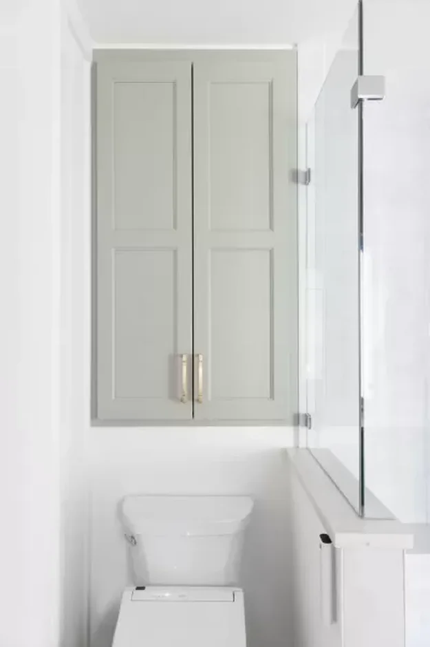 Added a storage cabinet above the toilet, maximizing vertical space with clean, built-in styling.