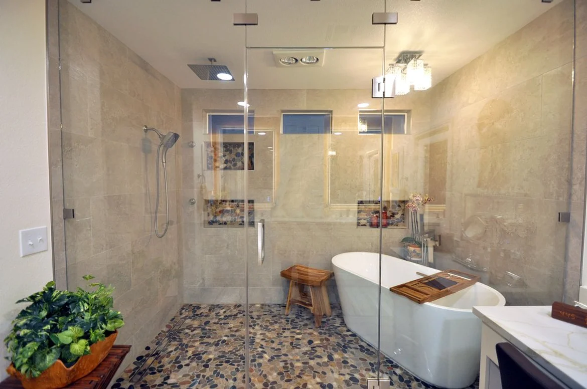 The shower floor was finished with natural pebble stone tile, providing excellent drainage, slip resistance, and a distinctive spa-like texture that enhances both safety and aesthetics.