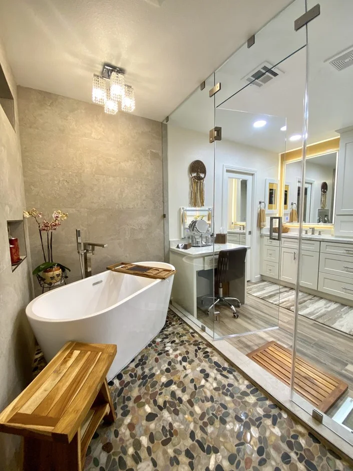 The original bathtub was replaced with a modern freestanding soaking tub paired with updated plumbing connections. This upgrade creates a strong focal point and adds a luxury element to the bathroom design.