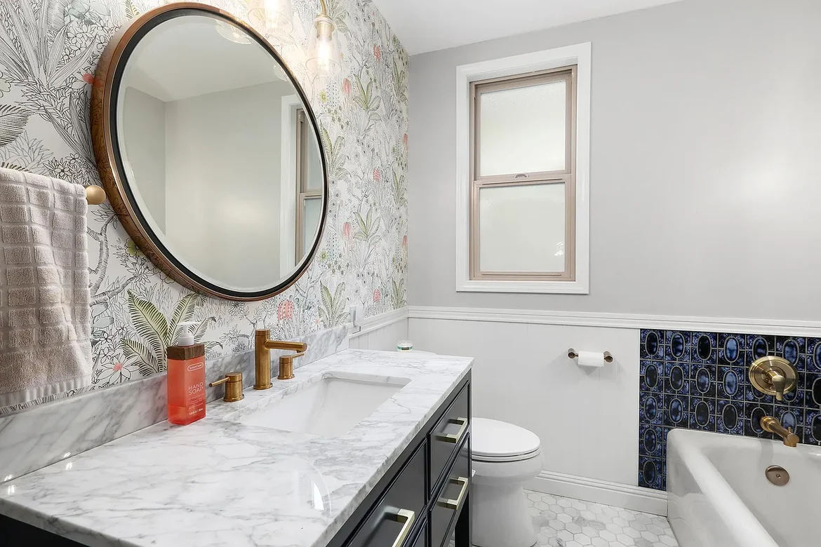 Walls were repaired and painted in a soft neutral tone, complemented by decorative wallpaper behind the vanity to create a subtle accent wall and visual interest.