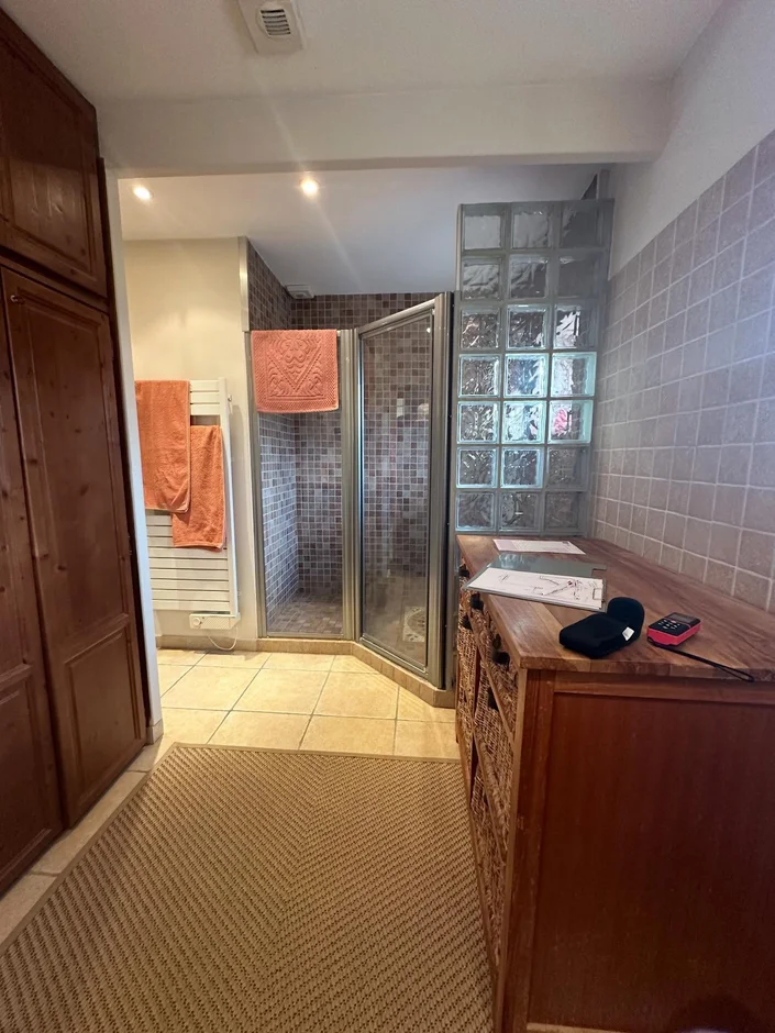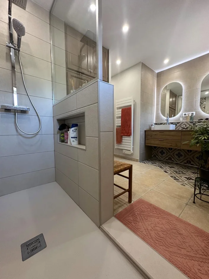 This bathroom renovation combines warm natural materials with clean contemporary detailing. The space is organized around a walk-in shower, a custom double vanity, and patterned tile accents, creating a balanced and functional interior with a calm, spa-like atmosphere.