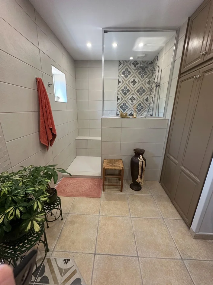 Added patterned ceramic tiles behind the vanity and inside the shower zone to introduce visual rhythm and contrast against the neutral tile palette. -