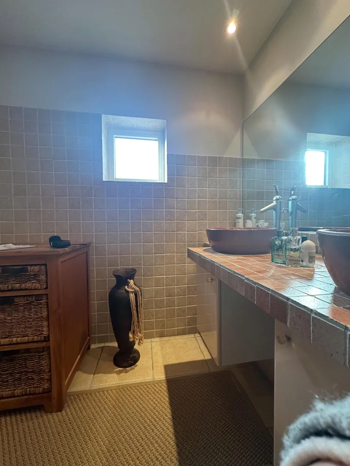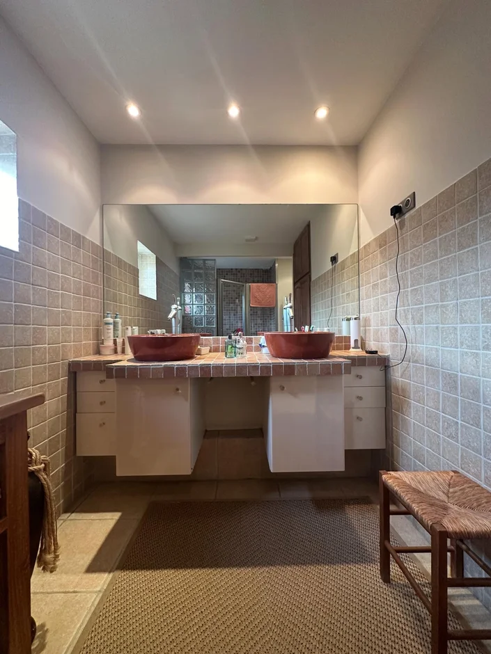 Designed and installed a wall-mounted wooden vanity with two integrated drawers and dual countertop basins. The floating design keeps the floor visually light and easy to clean. -