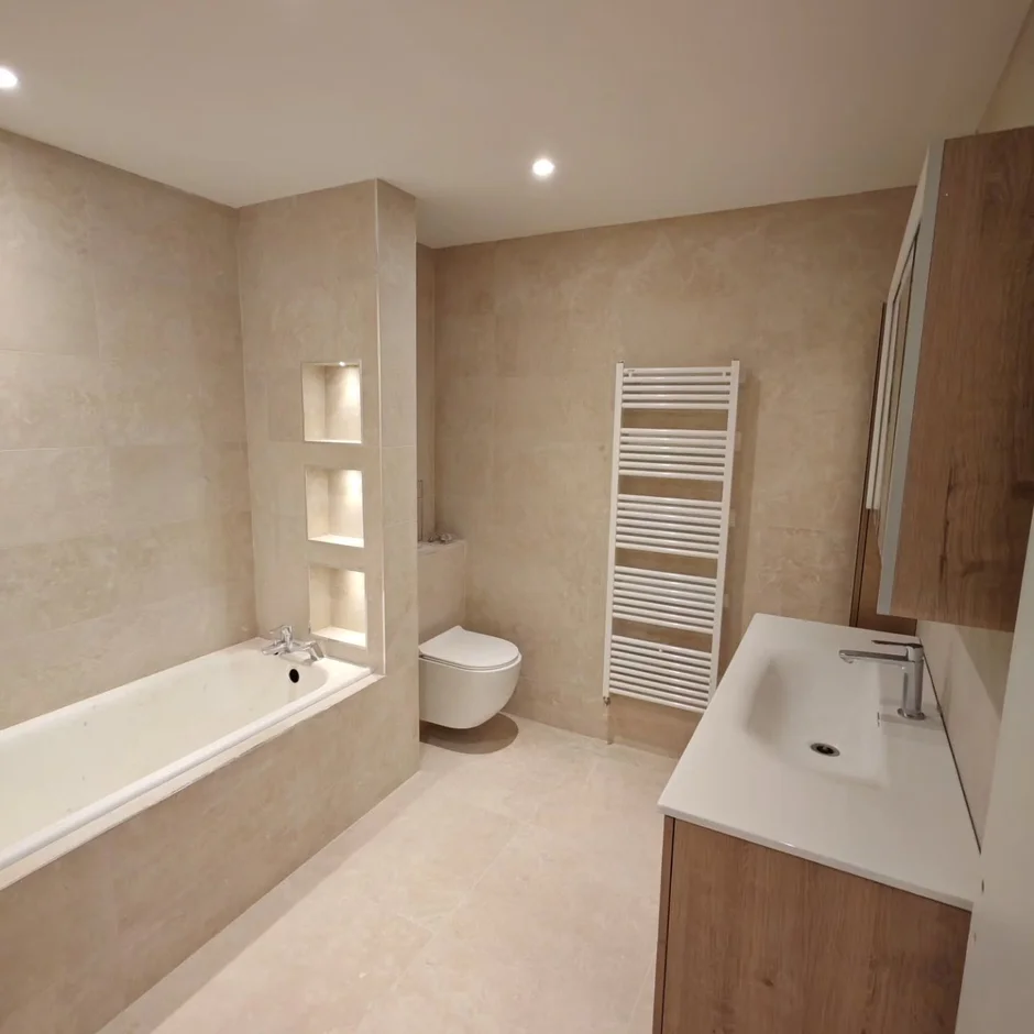 This bathroom renovation delivers a calm, modern atmosphere through a balanced mix of warm beige stone tiles, natural wood finishes, and clean-lined contemporary fixtures. The design focuses on functionality, visual harmony, and long-term comfort, creating a refined space that feels both practical and inviting.