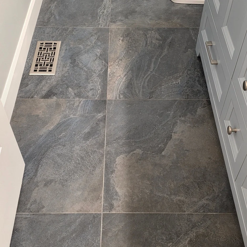 Installed large-format grey tiles with natural stone-like veining to create a bold and elegant foundation. -