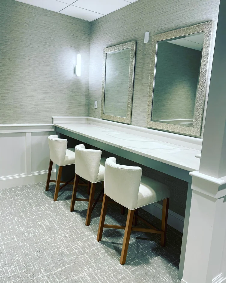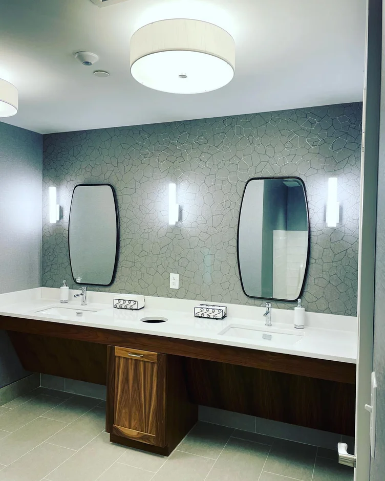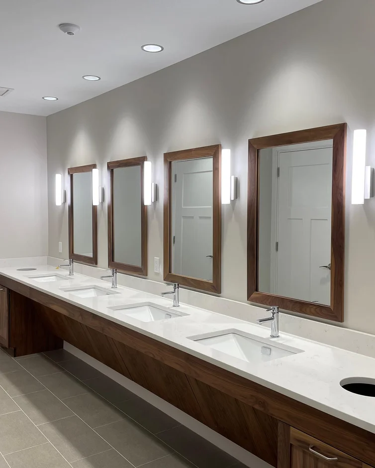 Wall-mounted mirrors with custom wood frames were installed, complemented by vertical LED wall sconces on each side. This lighting configuration provides balanced, glare-free illumination for users.