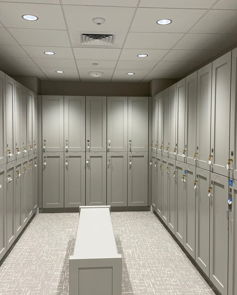 Floor-to-ceiling custom wood lockers were fabricated and installed, featuring secure hardware and consistent panel alignment. Natural wood finishes add warmth while maintaining durability suitable for commercial locker room use.