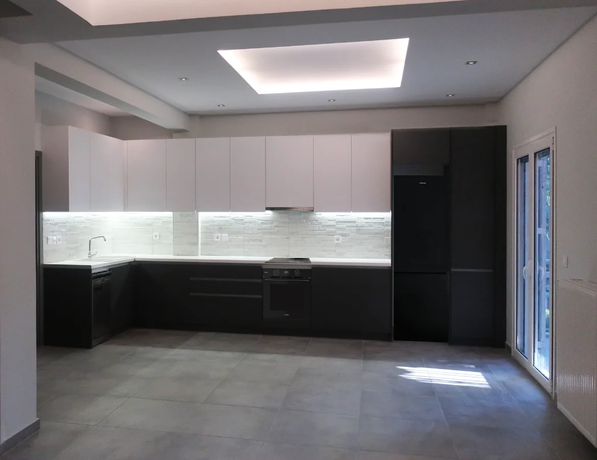 Installed a functional kitchenette with cabinetry, worktop, sink zone, and backsplash. Added under-cabinet/task lighting to improve usability while maintaining a sleek, modern appearance. -