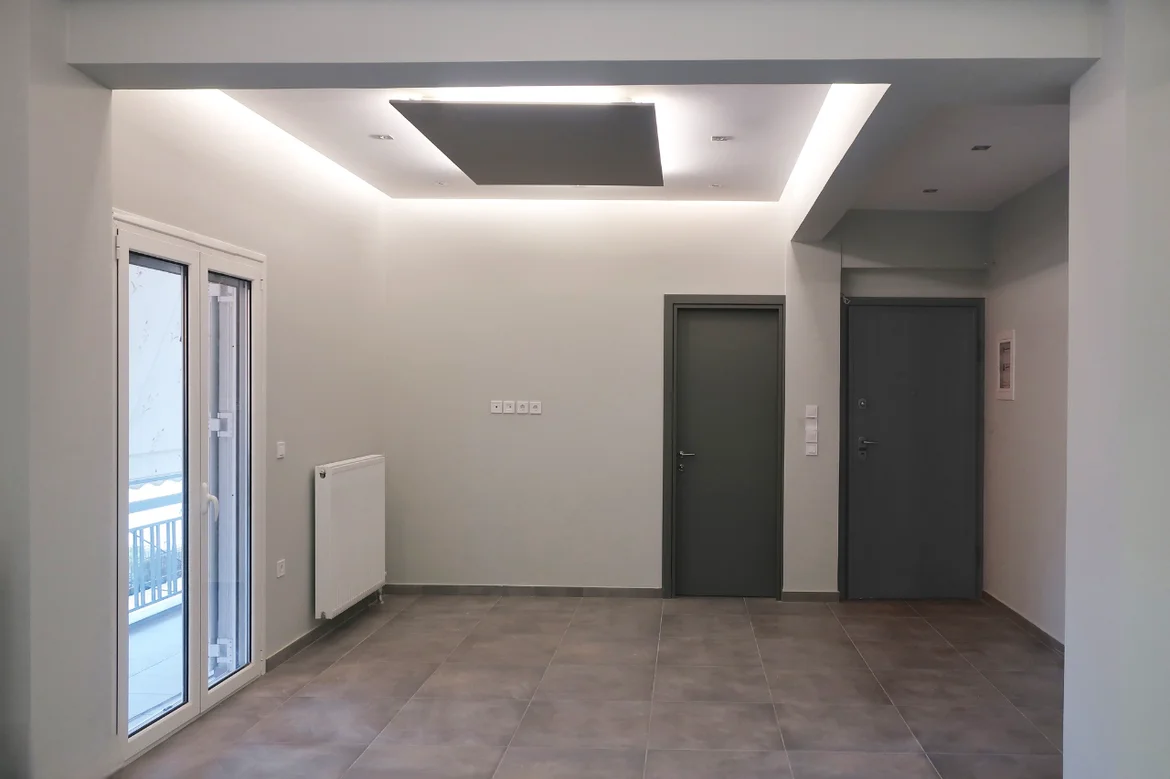 Completed wall and ceiling finishing in a light neutral palette and installed large-format floor tiles for durability and easy maintenance. Integrated modern ceiling detailing with recessed spots and indirect lighting for a clean architectural look. -