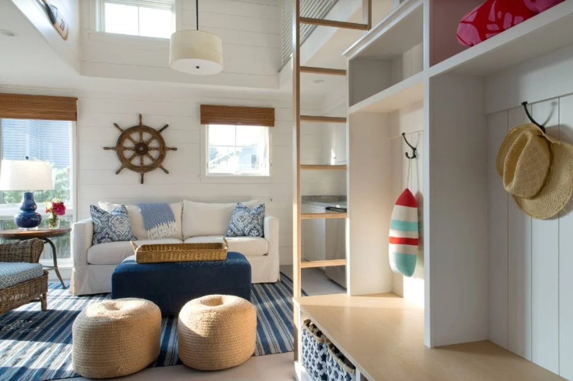 Curated decor with natural textures, nautical elements, and pops of blue and coral for a relaxed, beachy vibe.