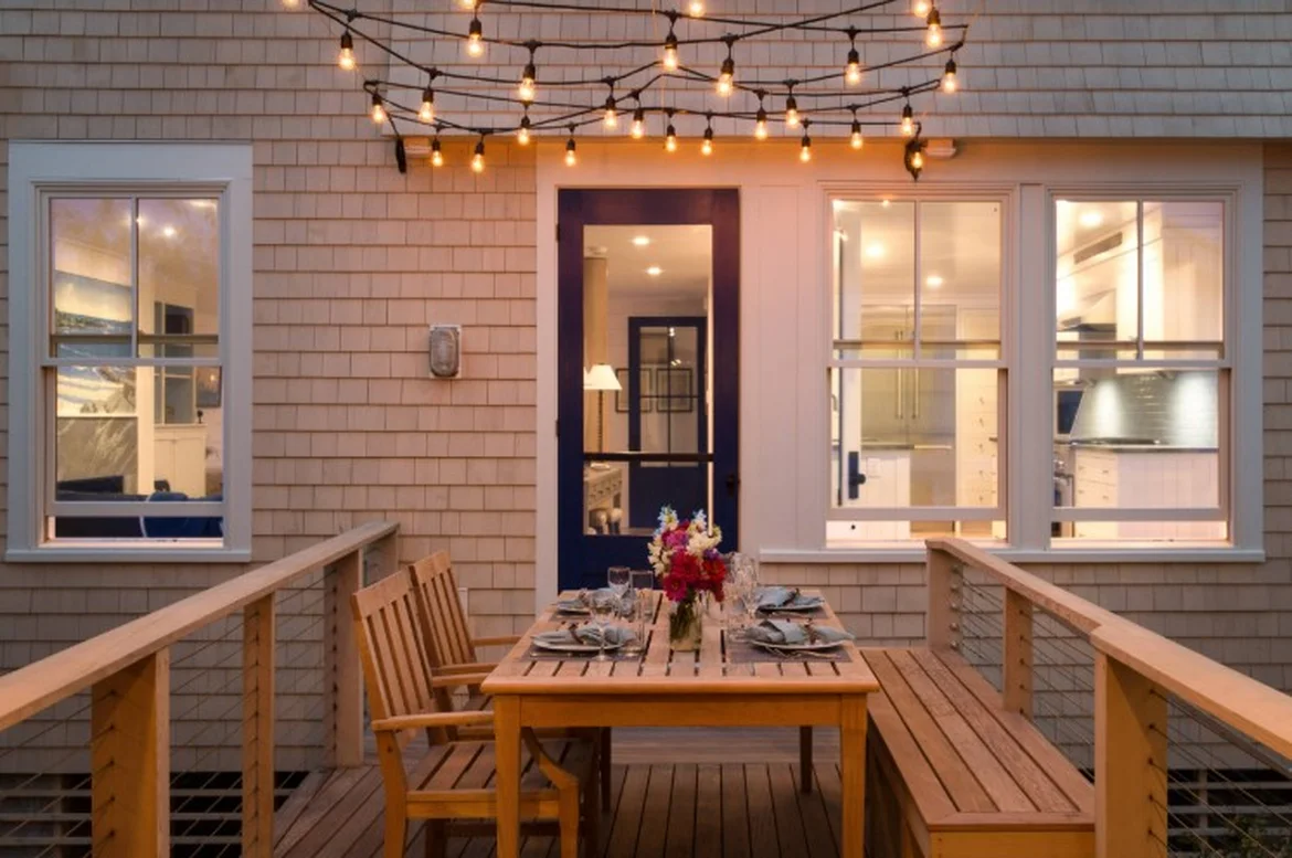 Built a charming outdoor deck with string lights, dining area, and direct access to kitchen for indoor-outdoor living.